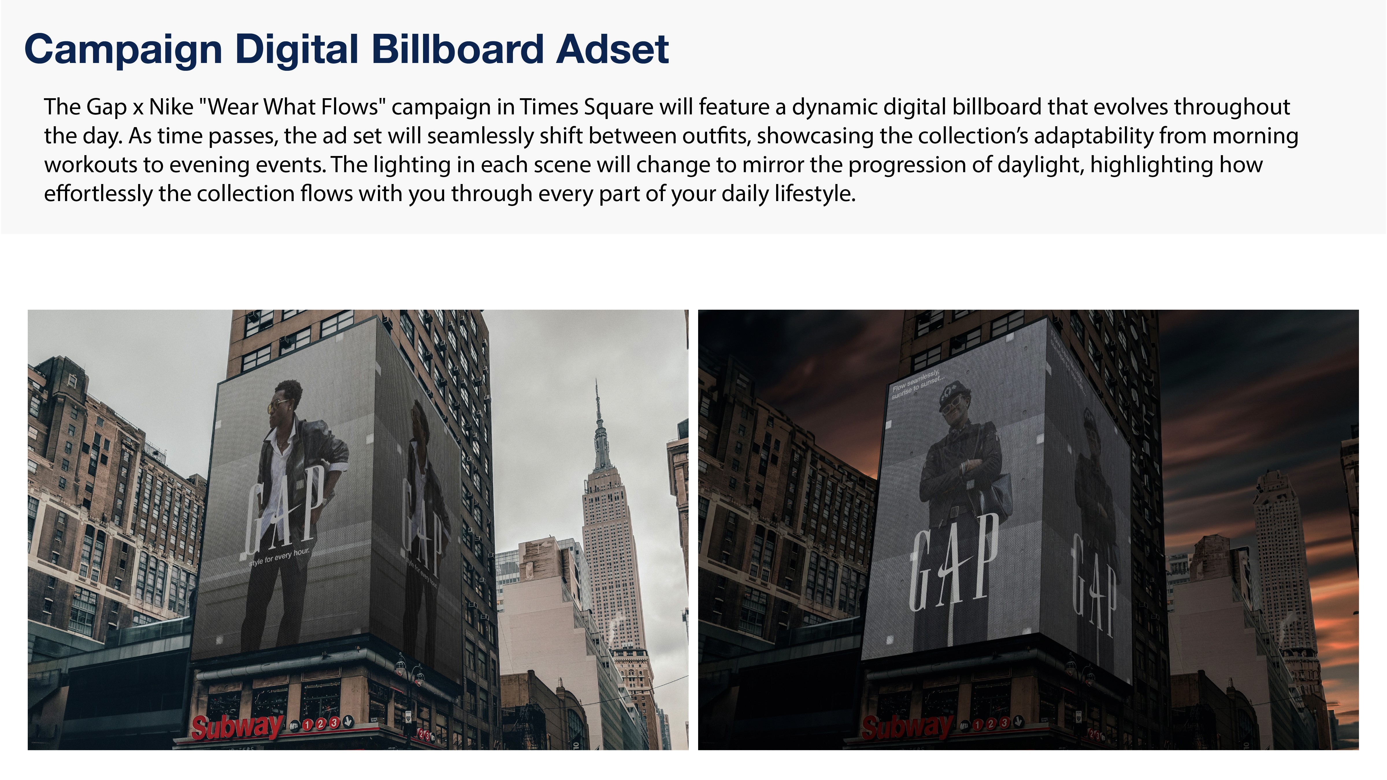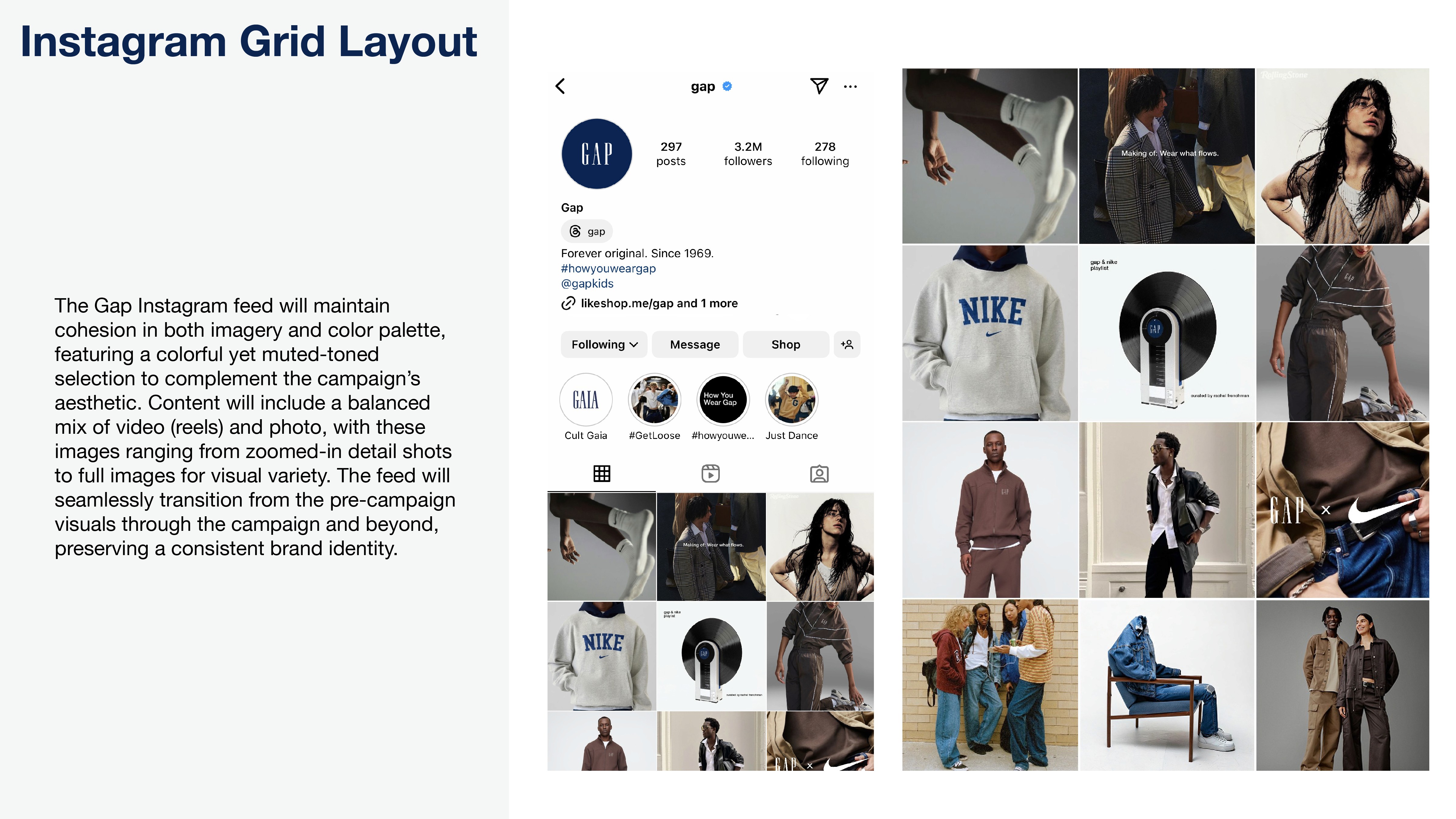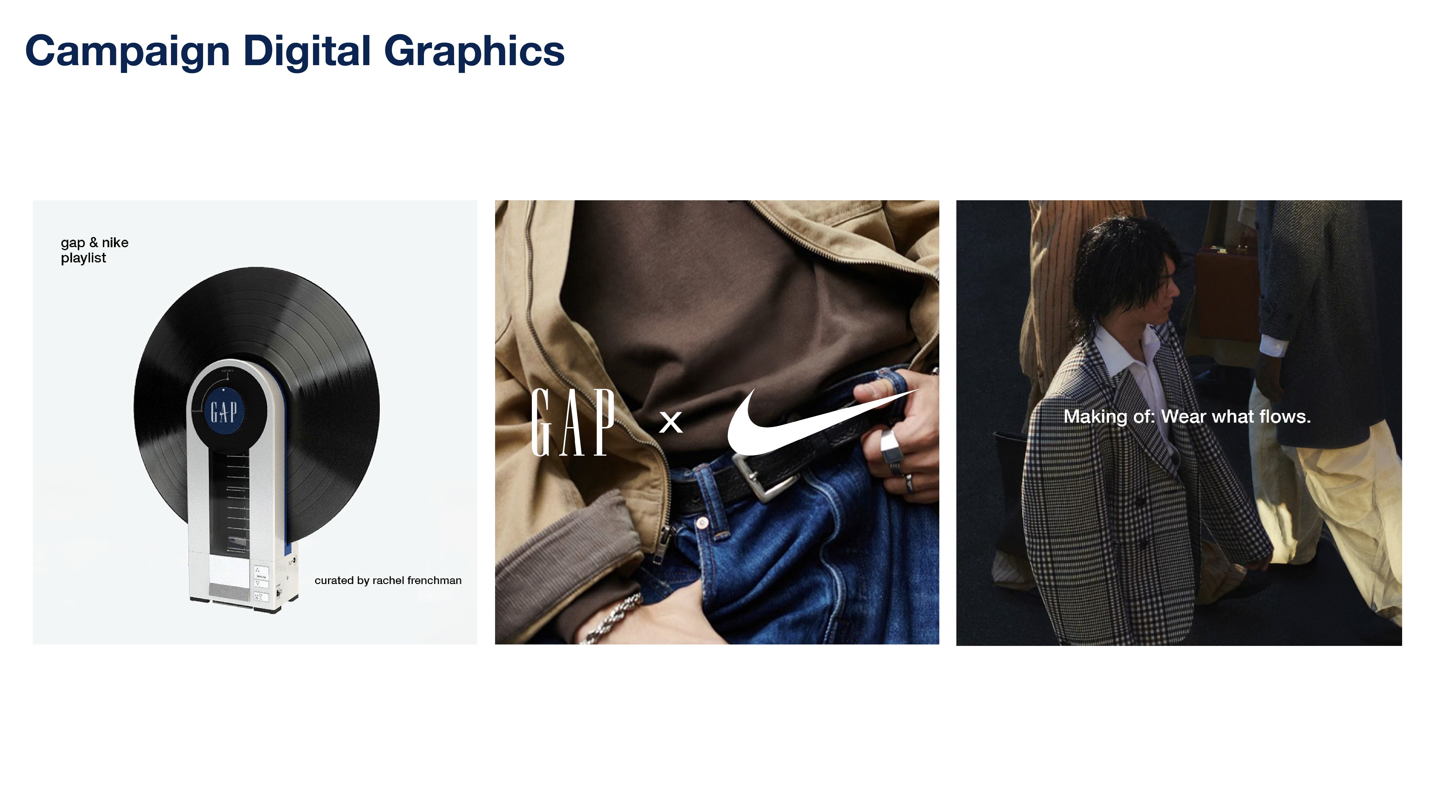 This Gap x Nike partnership redefines effortless style. "Wear What Flows" blends Gap’s timeless aesthetic with Nike’s athletic energy, making it seamless to transition from gym to street without missing a moment. Designed with the target audience, Gen Z in mind, it’s versatile, cool, and functional—boosting engagement and giving both brands a fresh and dynamic edge.
