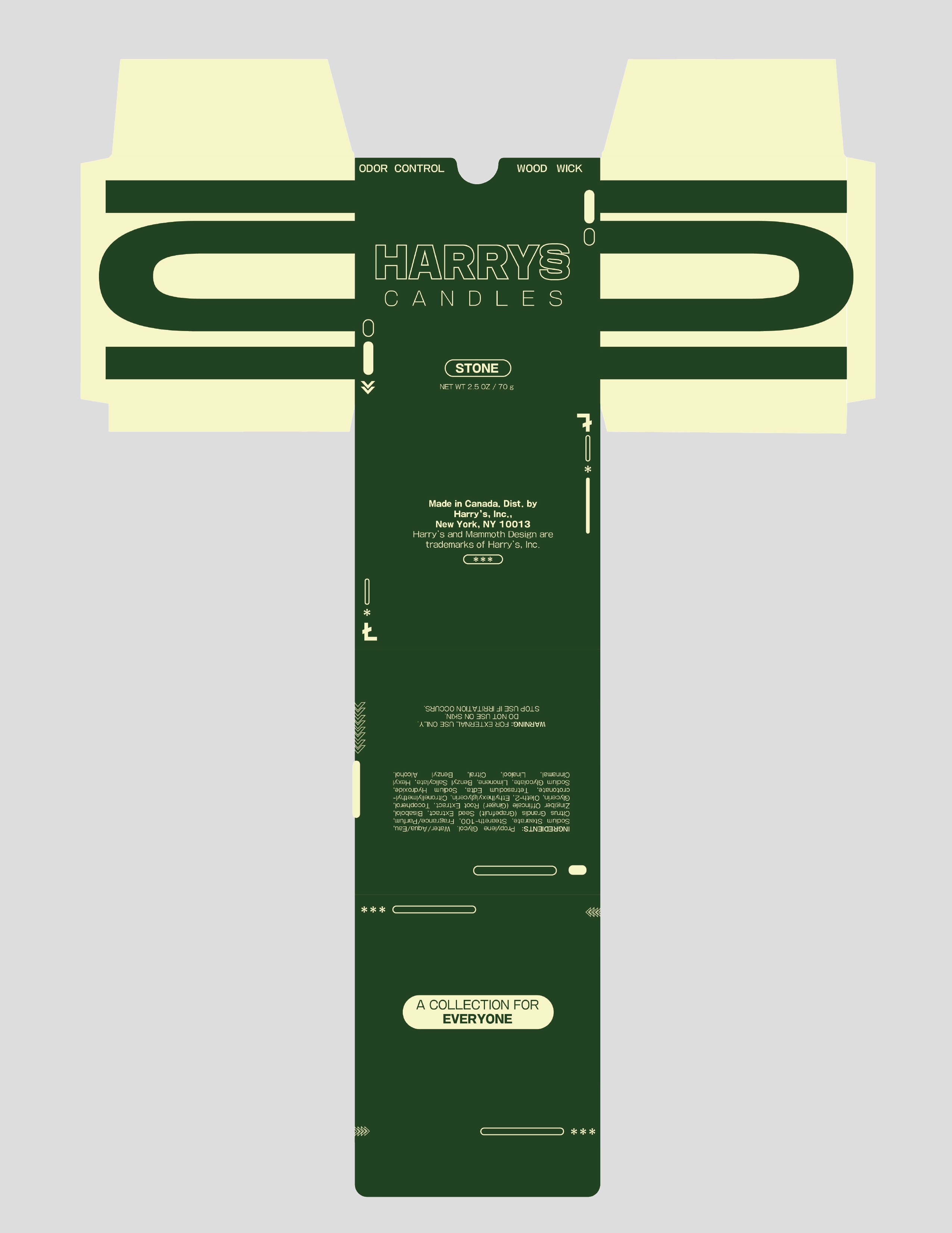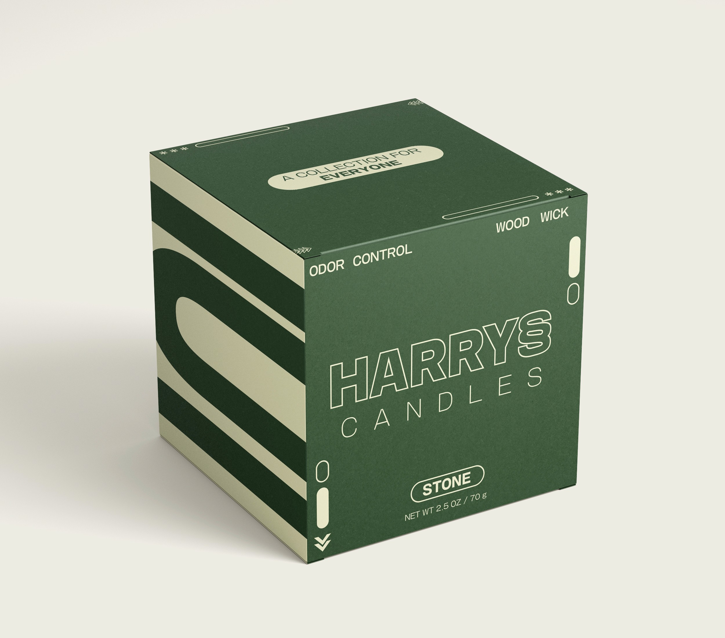 A re-design of a package and product to be a gender-neutral scented candle line. The original product deodorant brand, "Harry's", that marketed itself towards men. Final deliverable features a design that appeals to the new target audience.