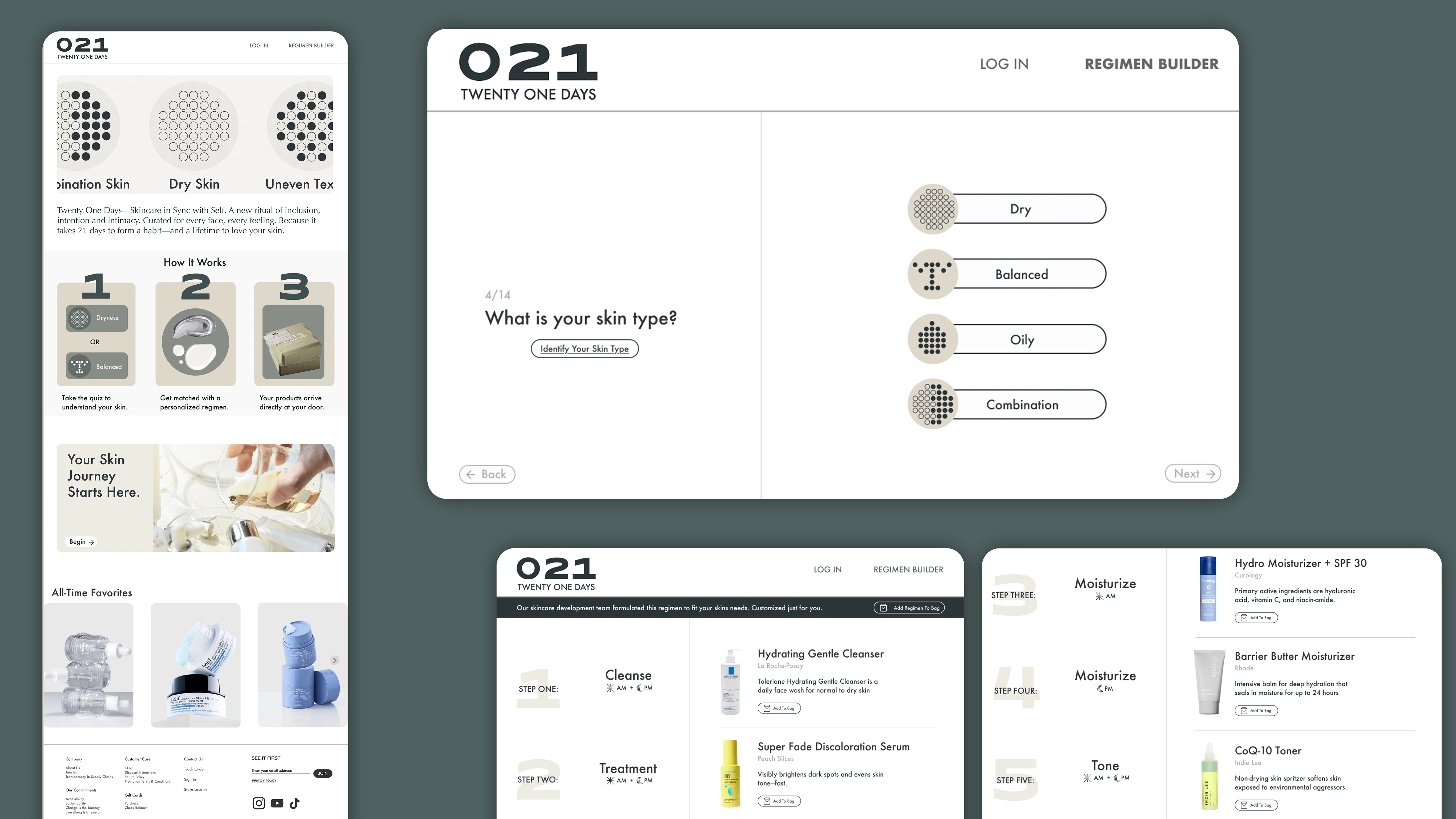 At the heart of 021 is personalized skincare as a system of understanding, not trend chasing. In response to an overwhelming and saturated market, the project reframes skincare into individualized, easy solutions through analysis and tailored routines across all brands. The title and custom dot-based icon set reference the idea that it takes 21 days to build a habit, reinforcing clarity and long-term confidence in a users experience.